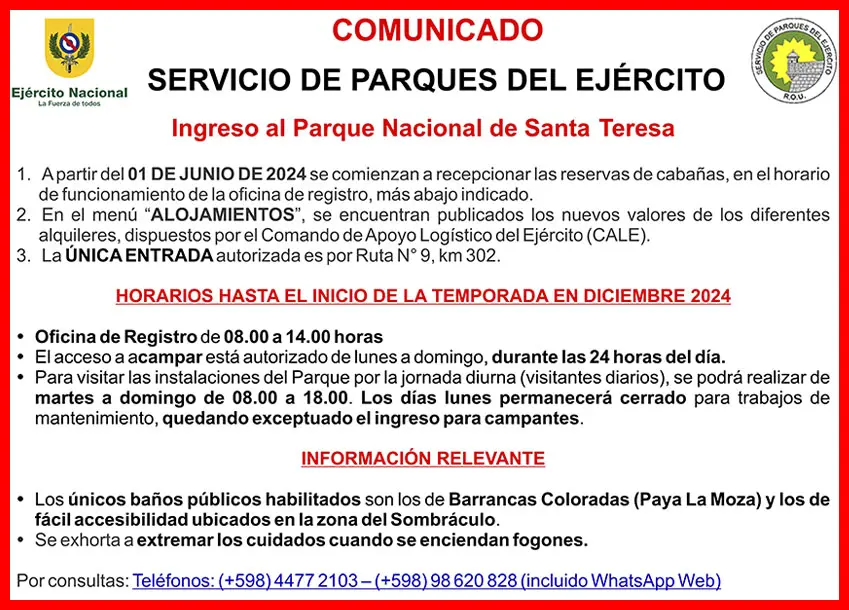 - Asimismo se hace saber al público en general que NO cuenta con ningún tipo de intermediario o agente inmobiliario autorizado a ofrecer reservas, alojamiento o estadías de cualquier tipo dentro de las instalaciones del Parque Nacional de Santa Teresa.